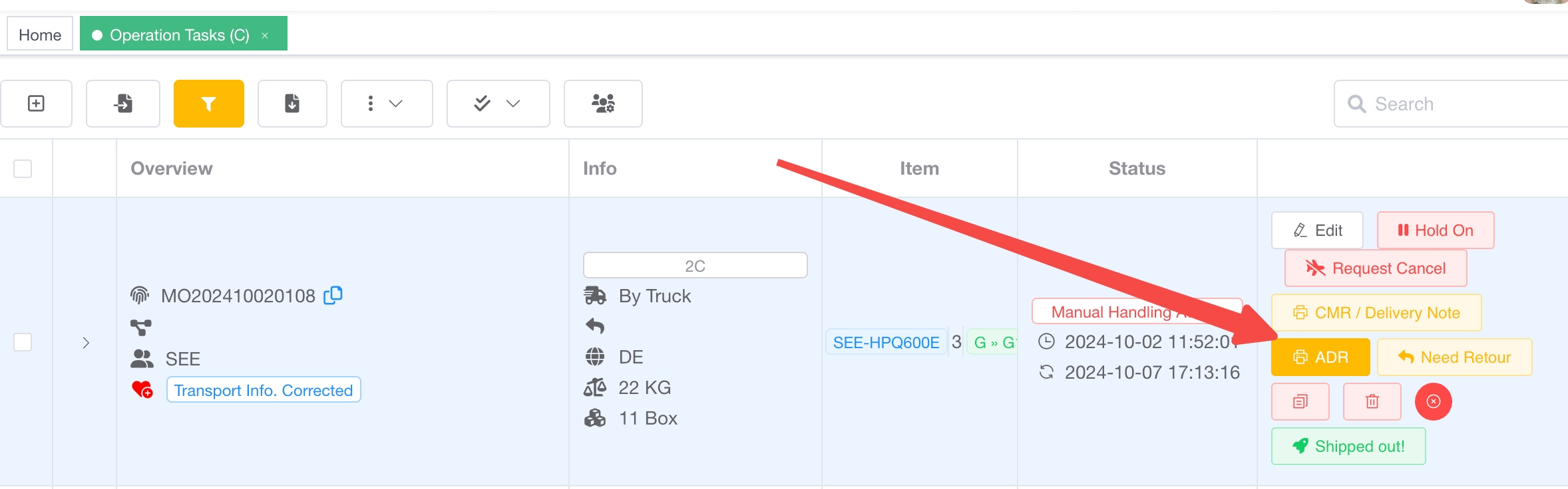 如果任务勾选了「Danger Goods」,填写完对应信息后,就可以在仓库视角打印ADR。